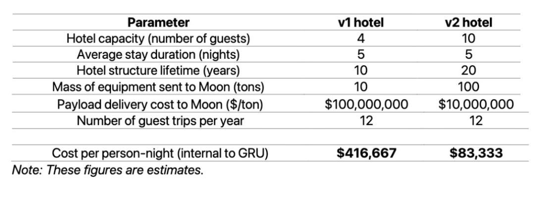 按照 GRU 的模型,第一版酒店的設備總重約 10 噸,內部成本約每人每晚 42 萬美元;到了使用 ISRU 部分本地化建造的第二版酒店,這個數字可以降到 8 萬美元左右。