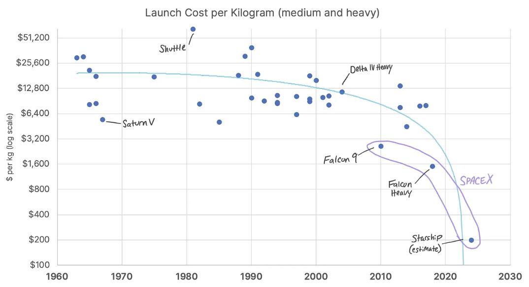 圖丨每公斤發射成本的變化(來源:Max Olson)