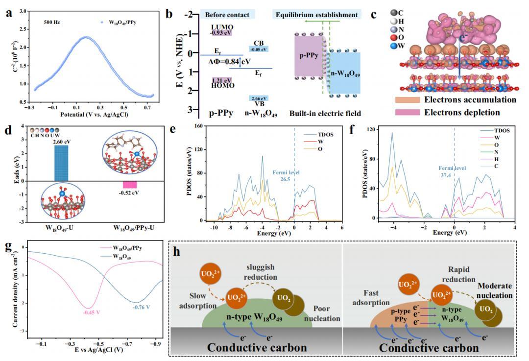 第一個能力是內置電場“吸鐵石”。氧化鎢和聚吡咯結合後,它們之間會產生一個微小的內置電場。這個電場就像一個定向的電子滑梯,能讓電子更順暢地從聚吡咯流向氧化鎢。結果就是,氧化鎢表面變得更容易抓住並馴服帶正電的鈾離子,並將之快速電還原爲鈾固體產物。簡單來說,它讓電催化劑對於鈾的吸引力更強、抓得更牢固,還原速率更快。