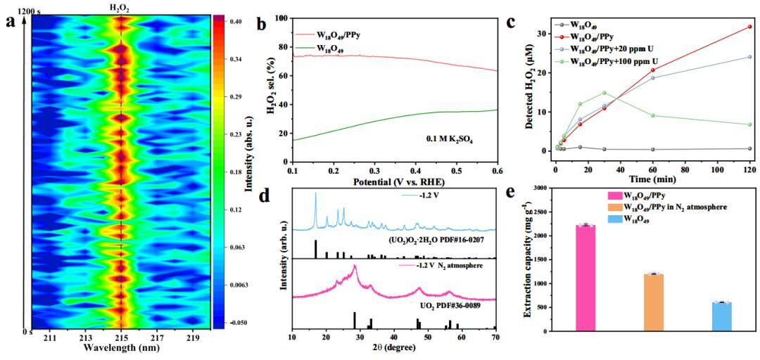 第二個能力是自產“沉澱劑”。聚吡咯本身有一個絕活:它可以充分利用水中的溶解氧,基於一種兩電子氧還原反應過程,穩定地生產出過氧化氫,也就是我們消毒時使用的雙氧水。這一點非常關鍵,因爲過氧化氫遇到水中的鈾離子,會立刻發生“點擊化學”反應,生成一種名爲過氧化鈾的黃色固體沉澱。