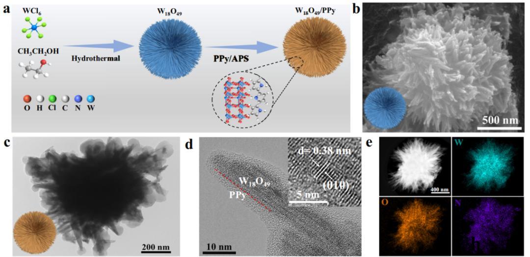 此次突破在於給該電催化劑材料設計了雙重功能,賦予了其兩條腿走路的本領。他們製造的這種特殊電催化材料,由兩種材料巧妙耦合而成:一種是無機物氧化鎢,另一種是有機物聚吡咯。氧化鎢長成了海膽形狀,而聚吡咯則像一層導電的果凍,均勻地包裹在海膽表面。
