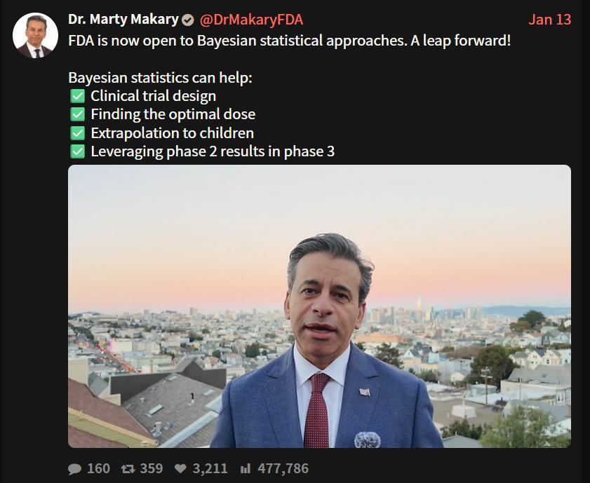 1 月 13 日,美國食品藥品監督管理局(Food and Drug Administration, FDA)發佈了一份指導草案,正式表態支持在藥物和生物製品臨牀試驗中使用貝葉斯方法論(Bayesian Methodology)。