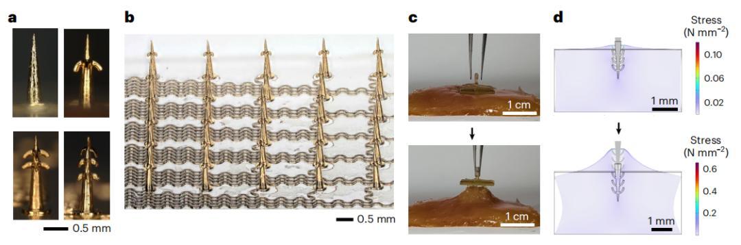 基於此,研究團隊提出了一種變形耦合的 3D 打印新策略,實現了在柔性襯底上加工高密度的微針倒刺陣列:首先打印出水平倒鉤的微針結構,再通過按壓的方法讓刺向下彎曲形成穩定的倒刺。