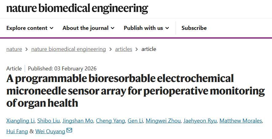 相關論文以《一種用於圍手術期器官健康監測的可編程、生物可吸收的電化學微針傳感器陣列》(A programmable bioresorbable electrochemical microneedle sensor array for perioperative monitoring of organ health)爲題發表在 Nature Biomedical Engineering 上[1]。達特茅斯學院博士後研究員李湘凌是第一作者,歐陽偉教授擔任通訊作者。