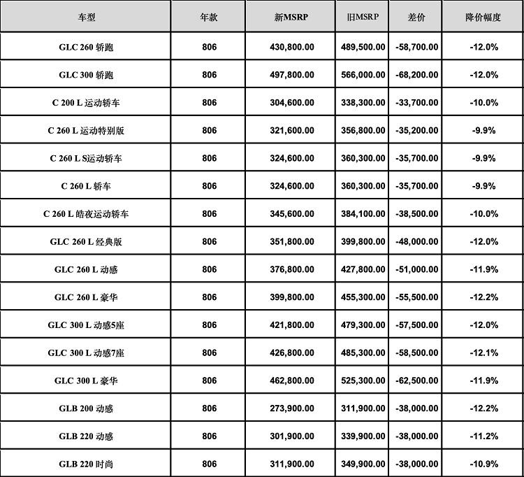2月1日,奔馳中國對部分車型的廠商建議零售價進行了調整,降幅約10%。其中,奔馳C級、GLB、GLC及GLC轎跑四款車型成爲此次價格調整的主要對象,部分車型降價幅度甚至高達12%,最高降幅接近6.902萬元。