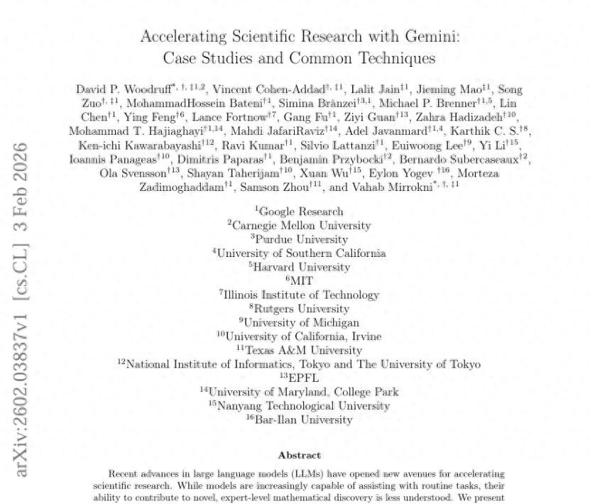 2 月 3 日,Google Research 聯合卡內基梅隆大學、哈佛大學、麻省理工學院等多所頂尖高校研究人員共同在預印本平臺 arXiv 提交了一篇論文:《利用 Gemini 加速科學研究:案例研究與通用技術》(Accelerating Scientific Research with Gemini: Case Studies and Common Techniques),詳細記錄了前沿大語言模型,特別是具備增強推理能力的 Gemini Deep Think 及其變體,如何從傳統的輔助工具轉變爲理論科學研究中的實質性合作者。