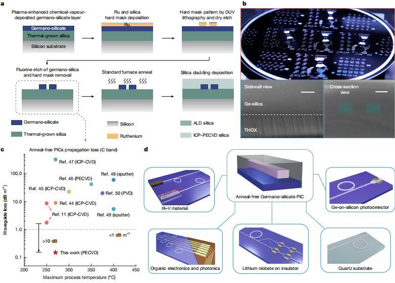 此外,即使在退火前,該光子芯片也能達到<1dB/m 的超低損耗,這代表與熱敏感材料(包括三五族半導體激光器、薄膜鈮酸鋰、有機光電材料)具有良好的多材料異質集成兼容性。