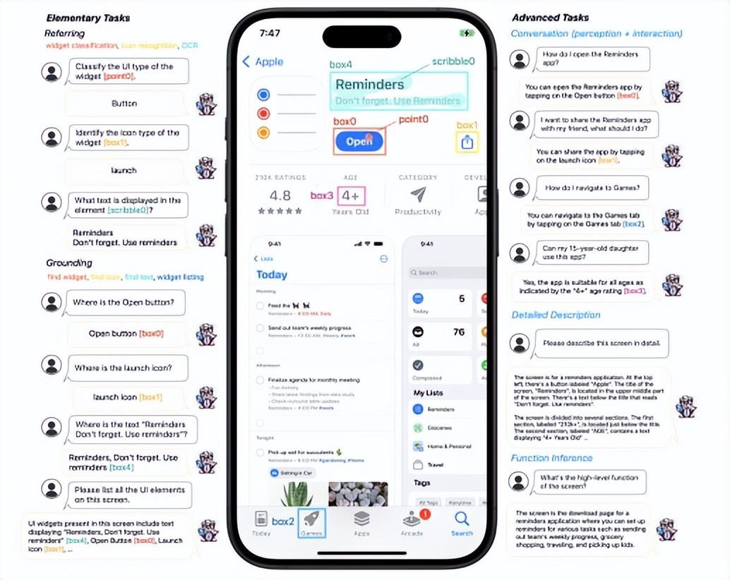 通過在涵蓋圖標識別、文本查找、組件列表等基礎任務,包含功能推斷、交互對話等高級任務的精選數據集上進行訓練,Ferret-UI 展現出了卓越的指代(Referring)與定位(Grounding)能力,其能描述屏幕內容,處理點、框、線條等空間指令都不在話下,還能對具體內容進行精確的座標區域定位,在理解移動 UI 的基礎任務方面甚至超越了當時佔據領先地位的 GPT-4V 模型。