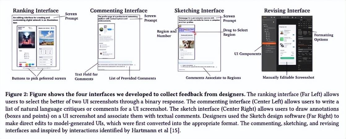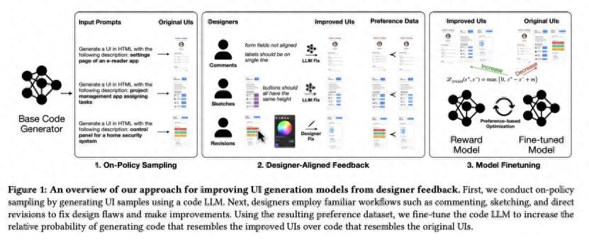 時間來到 2025 年 9 月,研究團隊在一項最新研究中展示了他們的最終成果,他們推出了一款貼合 UI 設計師日常工作流的反饋工具,允許設計師“評論”(Commenting)、“繪圖標註”(Sketching)甚至直接“修改”(Revising)AI 生成的界面,對其提供反饋。設計師的修改痕跡也將轉化爲訓練數據,用於對模型進行獎勵型微調。