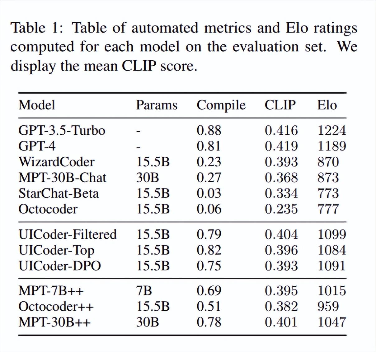 經過五輪“代碼生成-編譯器驗證-視覺匹配度評分(CLIP)-篩選去重”的迭代,這個名爲 UICoder、參數僅有 15.5B 的模型最終“無中生有”地掌握了 SwiftUI 編程,不僅在代碼的可編譯性上大幅超越基準模型,還在編譯成功率上擊敗了 GPT-4。