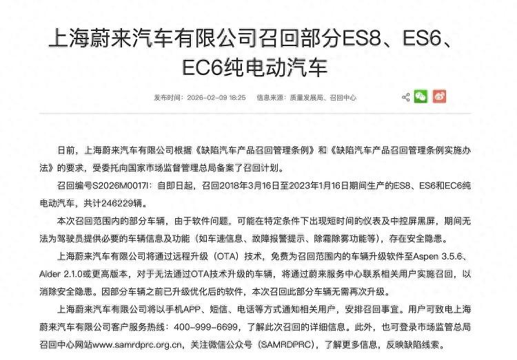 該召回編號爲S2026M0017I,此次召回涉及2018年3月16日至2023年1月16日期間出廠的所有ES8、ES6和EC6純電動車型。