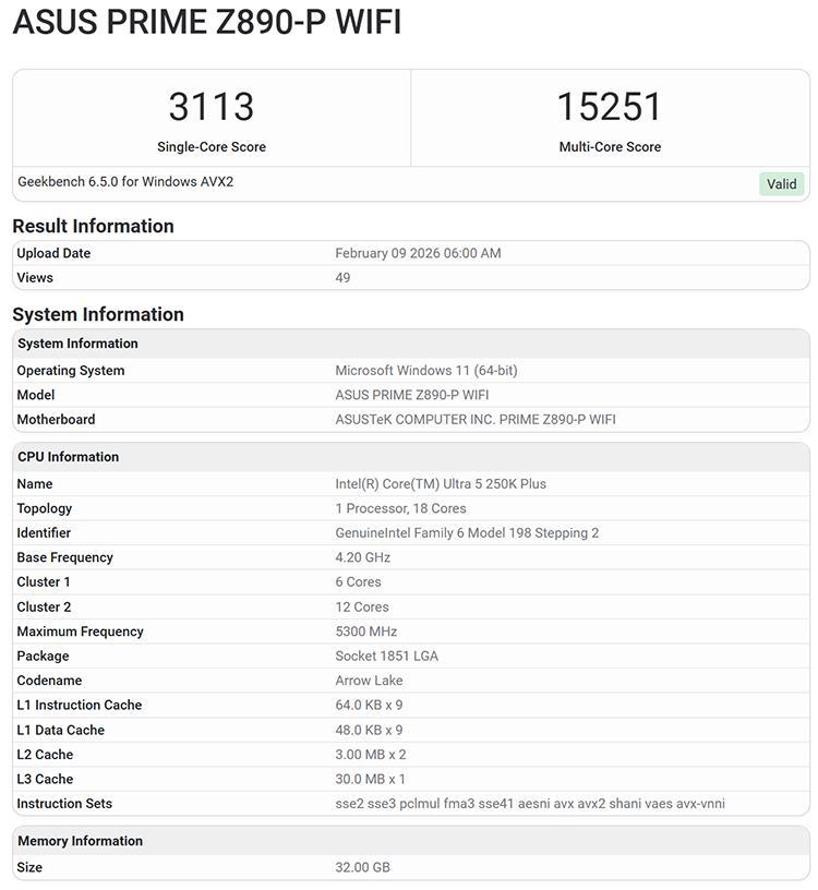 那在跑分平臺的結果中顯示,250K Plus在單核測試中得分爲3113分,多核爲15251分。從性能上來看相比現款的245K,在單核上提升略高於5%,但是多核成績不如245K(245K的多核跑分基本在17000-18000之間)。從表現上來說這個分數並不太正常,可能優化適配上還需要一定時間。