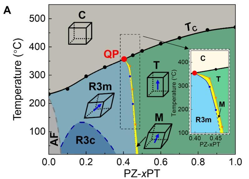 這次,該團隊換了一個思路:不再和材料本身的脾氣硬碰硬,而是給其創造一個能夠完美髮揮的工作環境。他們在傳統鋯鈦酸鉛壓電陶瓷中找到了一個在溫度和在成分相圖上極爲特殊的點——四相點。這是一個熱力學上的奇點,在這個點上,材料的四種不同晶體結構(立方、四方、單斜、菱方)可以和平共存,達到了一個熱力學上的臨界狀態,就像讓水、冰、水蒸氣同時穩定存在一樣。