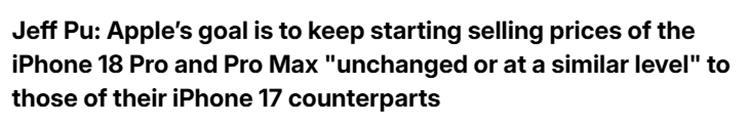 但是好在手機制造廠商多爲大型巨頭,供應商多少會給一點面子。根據廣發證券分析師Jeff Pu最新的分析,蘋果正在憑藉其強大的市場影響力,積極管控各類關鍵組件的成本,以避免iPhone 18系列漲價。蘋果的目標是讓iPhone 18 Pro和Pro Max的首發售價與iPhone 17系列同機型保持不變或基本持平。這意味着,iPhone 18 Pro有望在今年秋季以1099美元(國內爲8999人民幣)的價格發售,iPhone 18 Pro Max則爲1199美元(國內爲9999人民幣)。