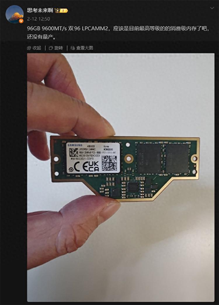 不過,在未來可能很快就將迎來轉機。近日,聯想Thinkbook的產品經理就在微博上發了一張LPCAMM2內存模塊的照片。該模塊來自於三星,採用LPDDR5X顆粒,提供9600MT/s的速率,且容量高達96GB。