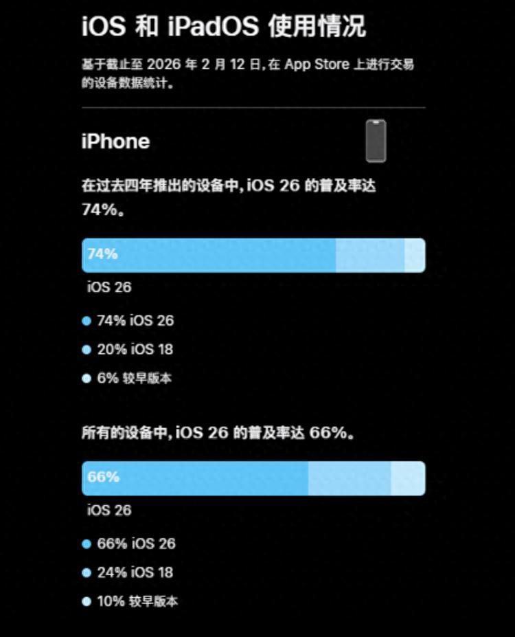 根據蘋果提供的消息,在過去四代手機中,iOS 26的安裝率達到74%,也就是說大約有16%的手機用戶仍然停留在iOS 18系統之中,大概率是因爲忘記更新,或者是懶得更新,不過如果將統計範圍增加到所有能夠支持升級到iOS 26系統的手機中去,那麼整體的安裝率就會有所下降,爲66%,看起來大部分消費者還是選擇將自家手機升級到iOS 26。