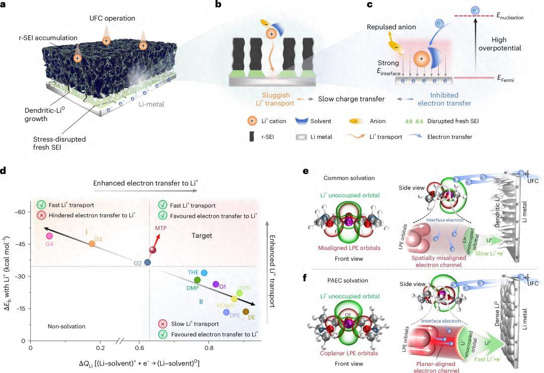 近日,來自中國科學技術大學任曉迪團隊、美國 SES AI 公司許康團隊在 Nature Energy 上發表成果,他們通過重新設計電解液裏的溶劑分子,讓鋰離子周圍的電子排成整齊的通道,大幅加速了鋰金屬電池的充電速度,最終在真實工業級的大軟包電池(2Ah 容量)上實現了 15 分鐘充滿電,而且還能比較穩定地循環。