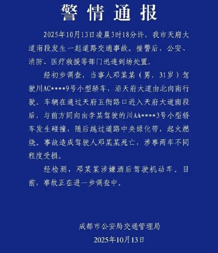 時間撥回至2025年10月13日凌晨3時18分許,成都市天府大道南段。31歲的鄧某某駕駛一輛小米SU7 Ultra小型轎車,在通過天府五街路口後,與前方同向由李某駕駛的小轎車發生碰撞,隨後車輛失控,越過道路中央綠化帶並起火燃燒 。事故導致駕駛人鄧某某當場死亡,兩車不同程度受損。