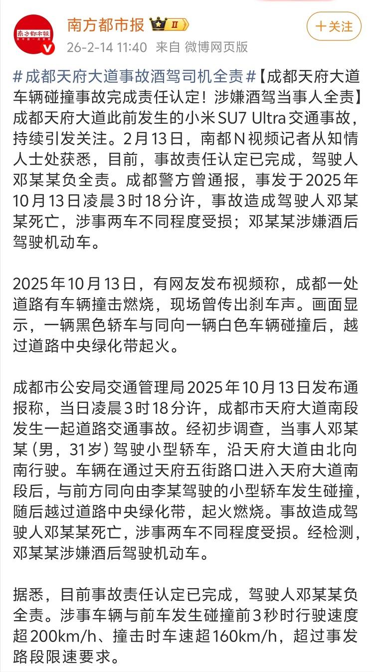 還記得去10月,引發全網熱議的成都天府大道小米 SU7 Ultra 交通事故嗎?