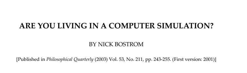 在這篇論文中,博斯特羅姆猜想,我們生活在某種超級先進的外星計算機中的可能性大約爲 20%。他核心論證是:如果文明發展到足夠先進的程度,擁有了製造高度逼真“祖先模擬”的技術能力,那麼他們很可能會運行大量這樣的模擬程序,出於科學研究、娛樂,或是其他我們無法想象的目的。