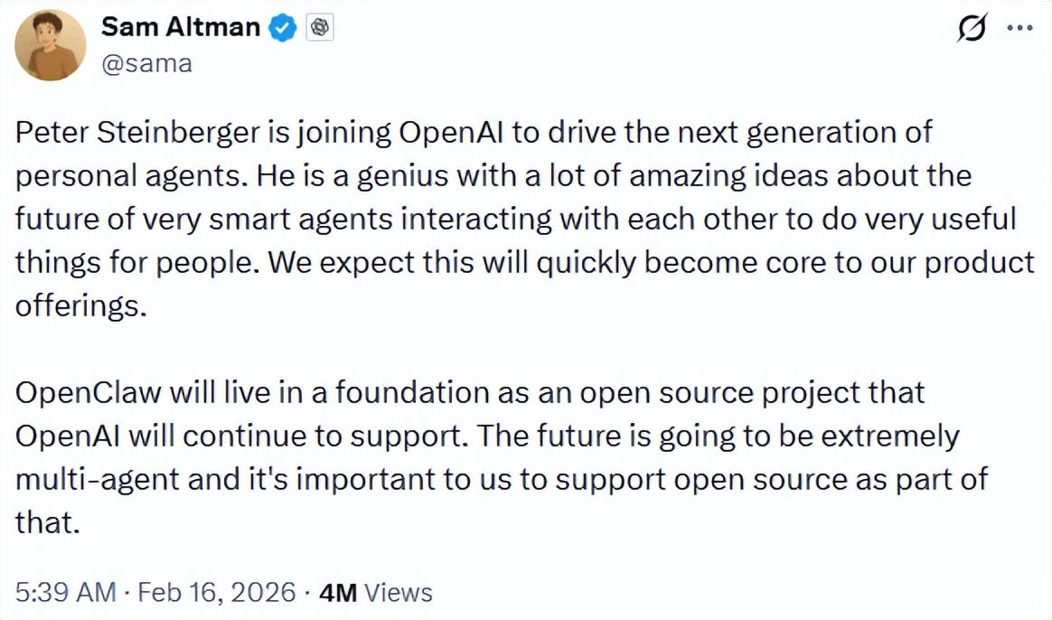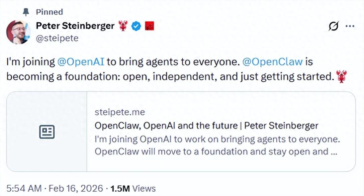剛剛,OpenClaw 創始人彼得·斯泰因貝格爾(Peter Steinberger)宣佈將加入 OpenAI,致力於讓所有人都能使用 Agent。