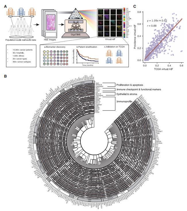 該研究不僅展示了從 H&E 生成 mIF 圖片的可能性,更重要的是,基於虛擬圖片實現了下游的臨牀發現:研究人員將 GigaTIME 應用於 1.4 萬餘名病人的 H&E 圖像中,這些數據來自美國最大的醫療機構 Providence Health,共包括美國 7 個州、51 家醫院和 1,000 多家診所。