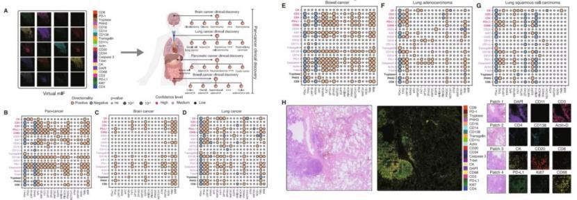 研究人員一次性生成了近 30 萬張虛擬 mIF 全切片圖像,涵蓋 24 種癌症類型和 306 種亞型。憑藉這些空前規模的數據,研究人員系統地揭示了 1,200 多個蛋白質和生物標誌物(如 TP53、KRAS 突變、TMB、MSI 等)、病理分期(TNM 分期)與具體癌症及亞型的關鍵聯繫。