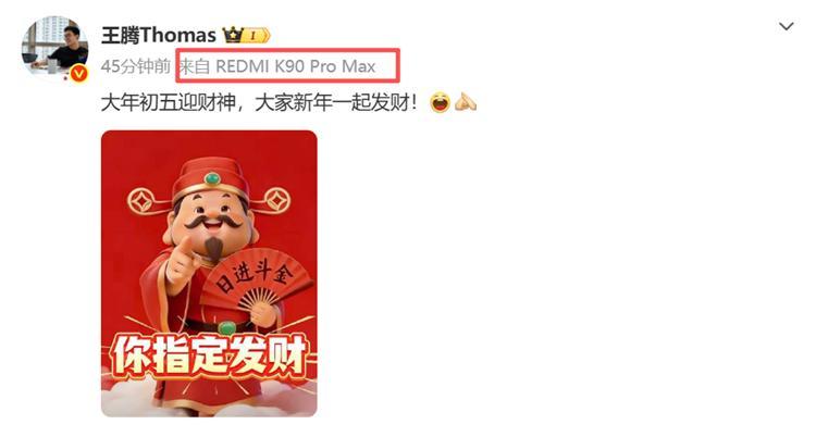 可能爲了回應“爭議”,今天初五送財神的祝福,王騰又用回了紅米K90 Pro Max。