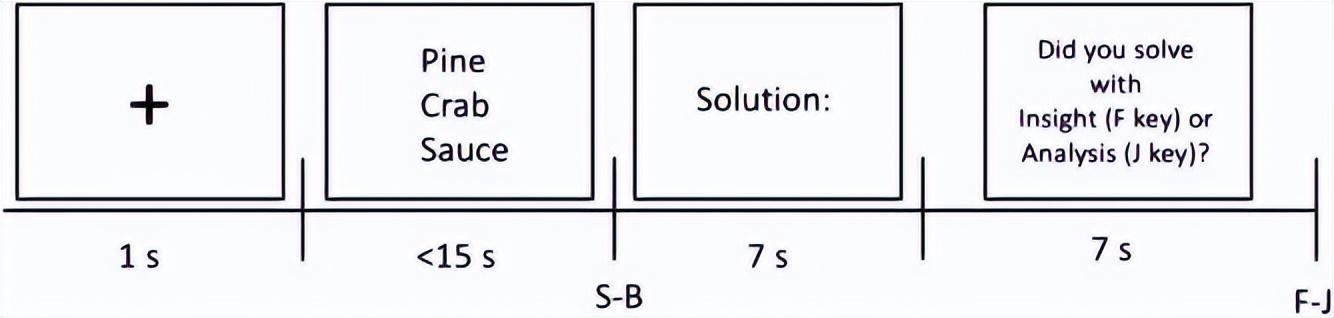 在研究中,團隊招募了 299 名大學生參與線上實驗,要求他們完成 60 道 CRA 問題(Compound Remote Associates,複合遠距聯想題)。CRA 是心理學中測量聚合思維(convergent thinking)的經典範式,給你三個看起來毫無關聯的詞,比如“pine”“crab”“sauce”,要求你找出一個能跟它們分別組成合成詞的第四個詞,答案是“apple”(pineapple、crabapple、applesauce)。每次答對之後,被試還要報告自己是怎麼想到答案的:是通過有意識的逐步分析(analysis),還是答案突然跳進腦子裏的頓悟(insight)。