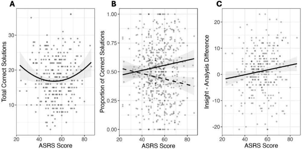 Kounios 團隊的邏輯是:這個“漏篩”恰好可能讓不相關的遠距聯想更容易進入意識,從而爲頓悟創造了條件。他們的迴歸分析也支持這一點:隨着 ASRS 分數升高,被試通過分析解題的比例線性下降(β=−0.12,p =.046),通過頓悟解題的比例線性上升(β=0.11,p=.05)。兩條趨勢在中間段此消彼長、彼此抵消,正好解釋了爲什麼過去的研究一直沒能找到 ADHD 與聚合思維之間的顯著相關,因爲那些研究只看總正確率,沒拆分解題策略。