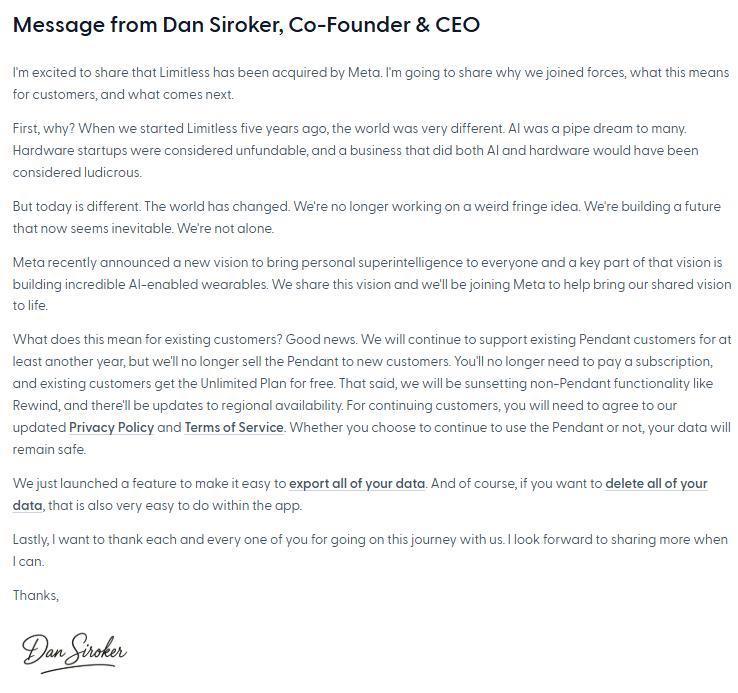 但這種“新意”沒能持續太久,從公司成立到被收購僅 5 年時間。據該公司公告,自 2025 年 12 月 5 日起,Limitless 服務在巴西、中國、歐盟、以色列、韓國、土耳其和英國停止服務。