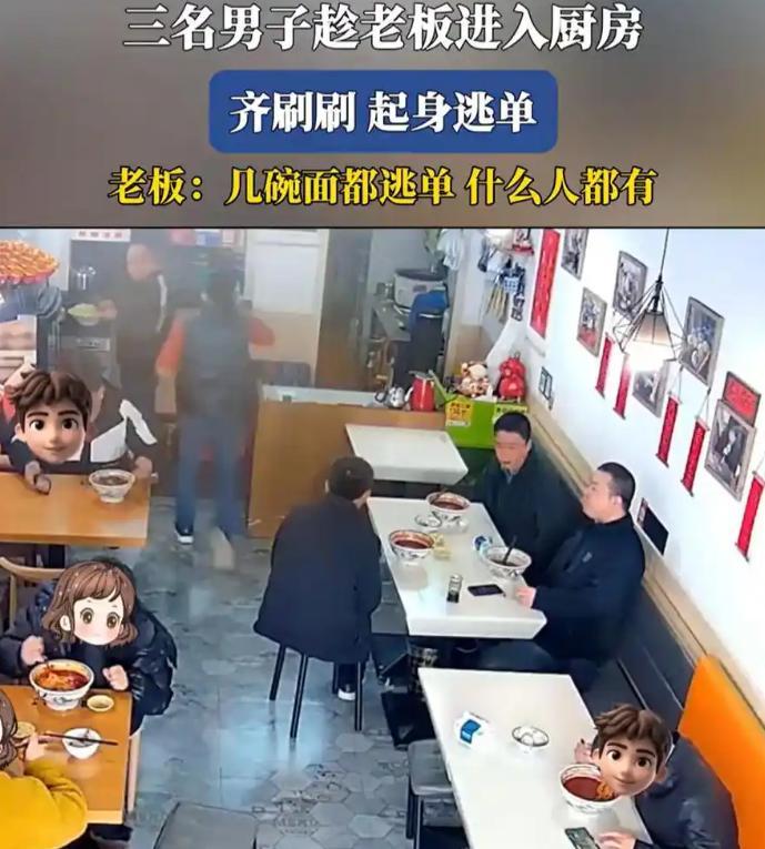 2月27號那天,店裏來了三個男的,坐下點了面,喫完了一直沒動。監控裏看得很清楚,三個人坐那也不聊天,眼神老往廚房那邊瞟。其中一個戴藍帽子的,身子繃得直直的,盯着老闆的動向。