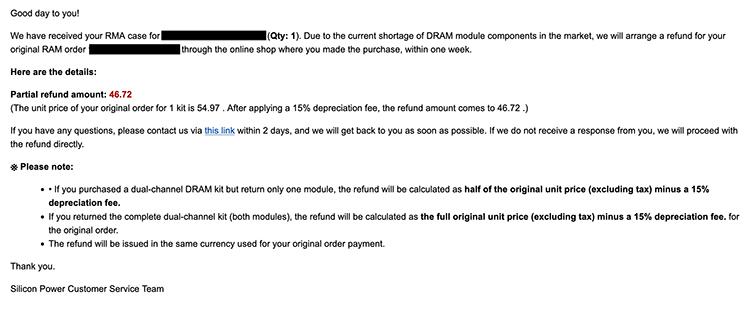 然而不巧的是,在維修期間發生了內存漲價的事情,走完售後流程後,Silicon Power認爲產品存在缺陷,所以決定給用戶退貨退款,但神奇的是居然要收15%的折舊費!網友當時買這套內存條花了54.97美元,扣掉15%後只給他退回來46.72美元,這讓網友非常惱火,反手就把Silicon Power這個行爲掛到網上。有其他網友不相信事情竟然這麼離譜,於是老哥便曬出了官方給他回覆的郵件截圖。