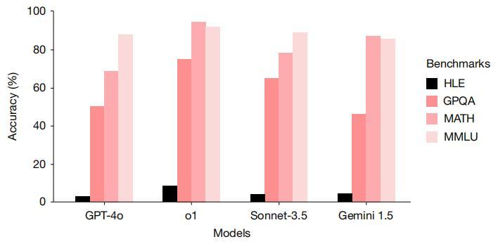 之所以出這套新卷子,是因爲當前最聰明的大模型在那些曾難倒無數學生的考試裏,已經能夠考到 90 分以上。MMLU 這樣一個包含 57 個學科、14,000 道題目的超難測試,AI 早就拿到了接近滿分的成績。