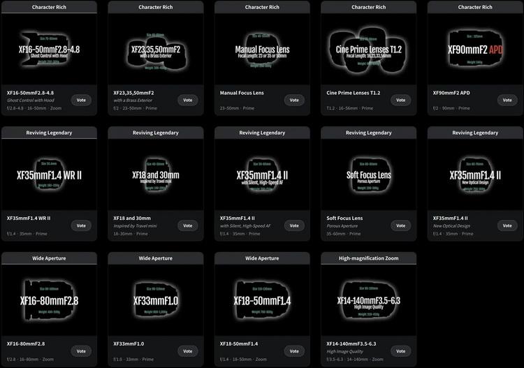 目前富士共列出了14種不同的概念鏡頭供攝影師投票,當中有XF 23/35/50mm F2便攜鏡頭,也有XF16-80mm F2.8、XF18-50mm F1.4超規格鏡頭,甚至有湊數的23/35/50mm手動對焦鏡頭,反正選擇很多。除了焦距、光圈參數,富士還給出這些鏡頭對應的尺寸、重量以及濾鏡口徑範圍。