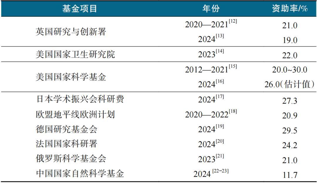 從國際經驗看,爲克服評估高相關度難以實現的困境,多數科研資助體系選擇維持相對較高的資助率(普遍超過20%,見表1)。即便如此,仍有學者指出,20%的資助率對於青年學者的職業成長而言並不健康。值得關注的是,近年來中國科學基金資助率持續下降,2024年面上項目平均資助率已降至11.7%。據此反推,對應的相關係數需達到ρ≥99.3%,這一標準在實際操作中同樣難以企及。因此,過低的資助率會導致基金資助評審極易被評價“噪聲”所幹擾: