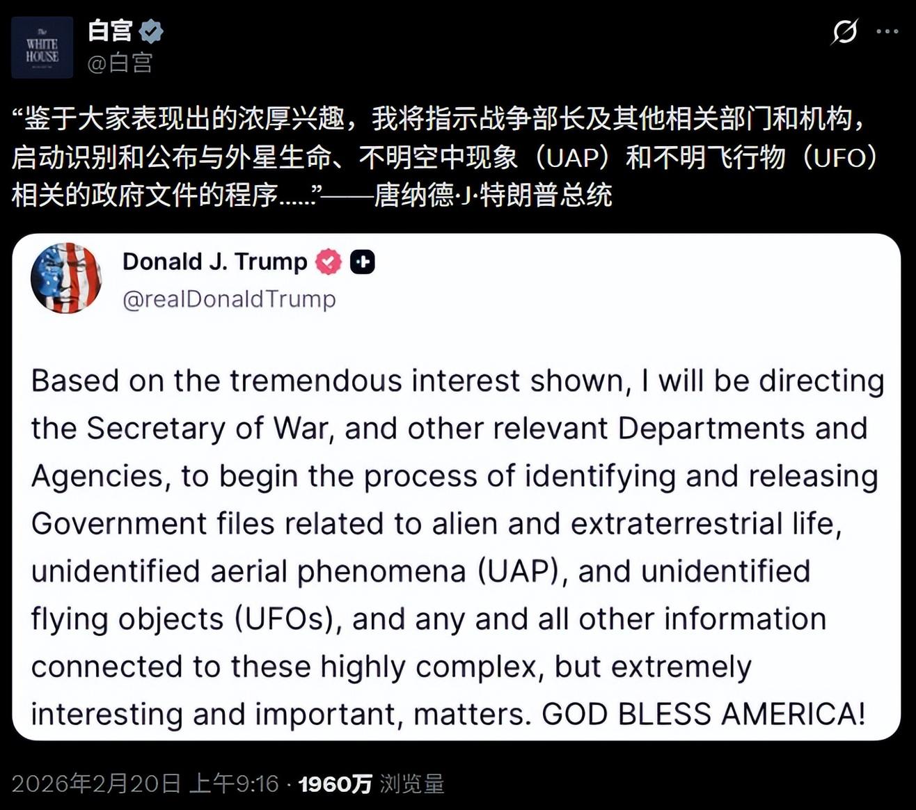 同日,特朗普在 Truth Social 平臺正式發帖宣佈:“基於公衆表現出的巨大興趣,我將指示國防部長和其他相關部門及機構,全面識別並公開與外星生命、不明空中現象(UAP)、不明飛行物(UFO)以及任何與之相關的所有信息的政府文件。”白宮官方賬號隨後完整轉發了這一聲明。