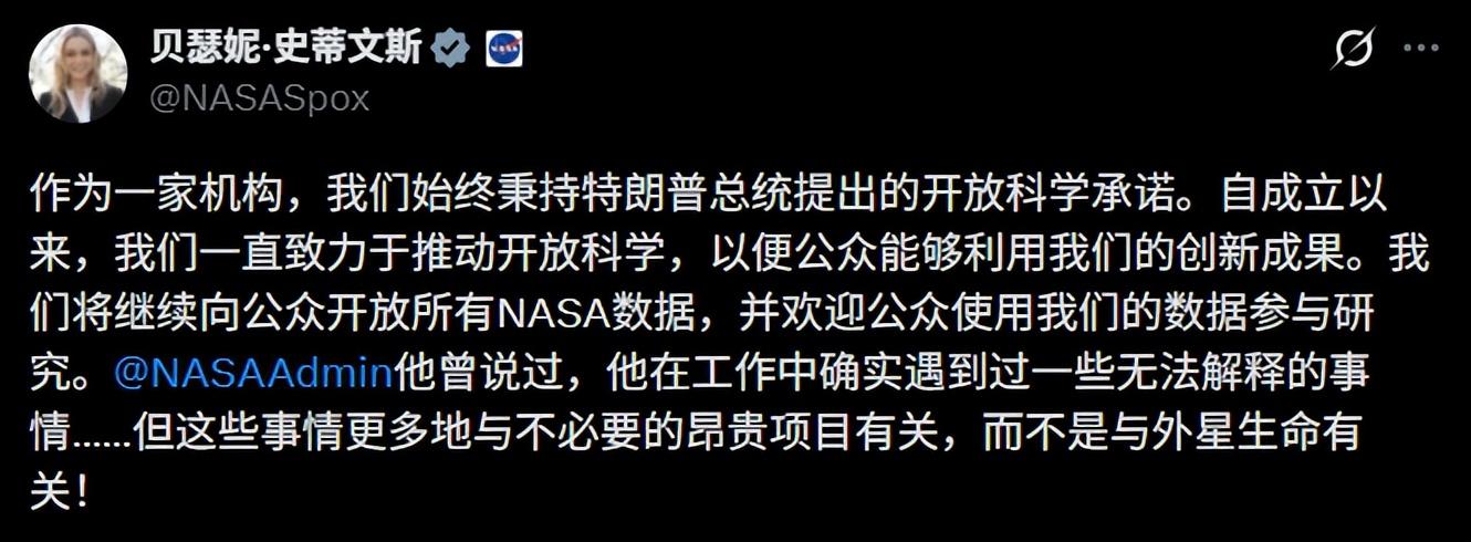 20 日,NASA 發言人貝瑟尼·史蒂文斯(Bethany Stevens)在 X 平臺回應稱:“我們繼續擁護總統在開放科學方面的承諾……我們將繼續公開所有 NASA 數據,並歡迎公衆使用這些數據參與研究。”她還幽默補充,NASA 遇到的“無法解釋的事物”通常是項目嚴重超支,而非外星生命。