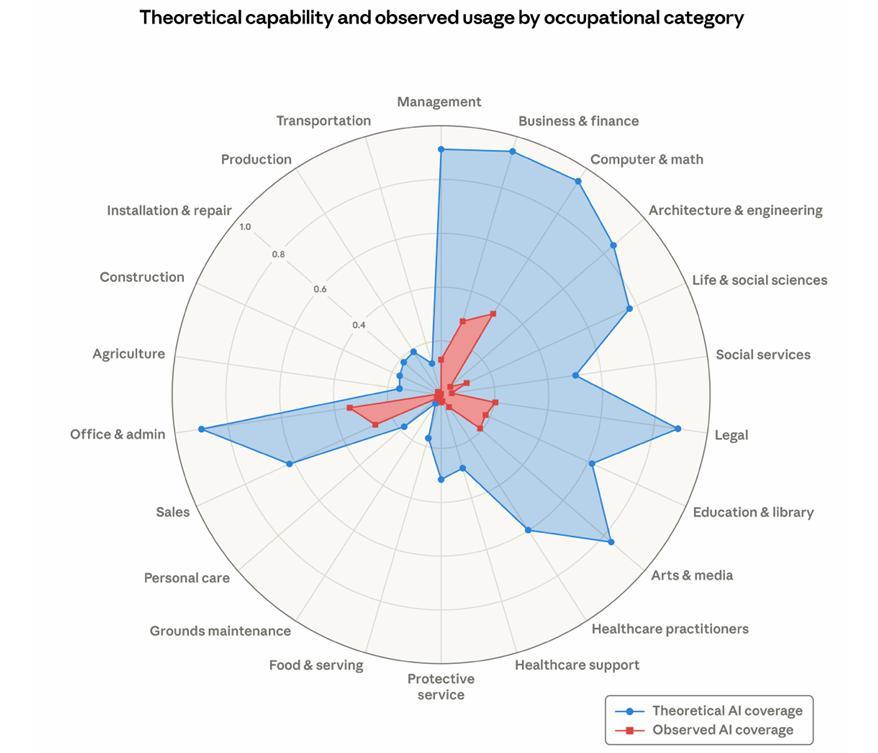 圖 | 不同職業類別的理論能力與實際暴露度對比(來源:Anthropic)