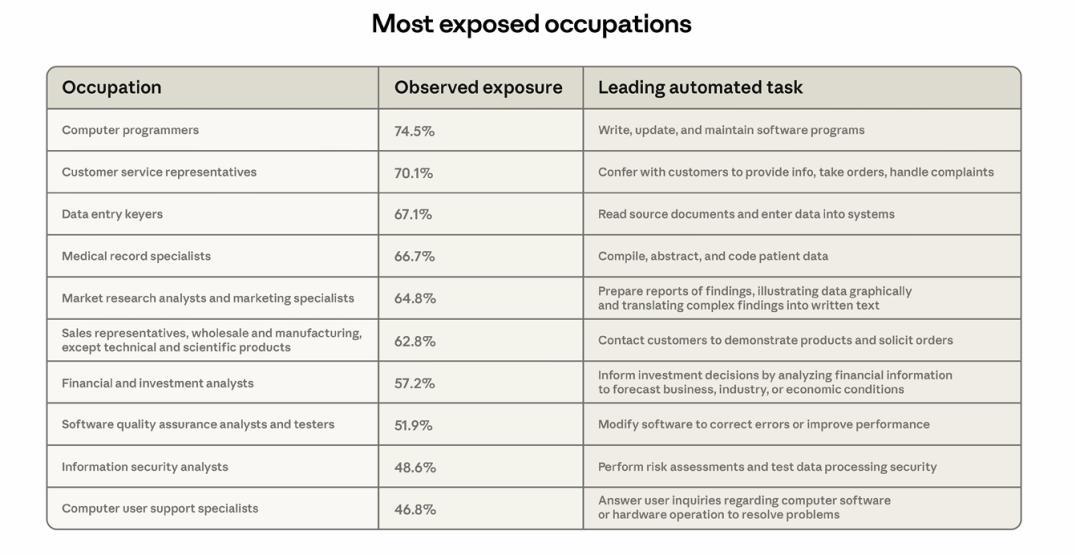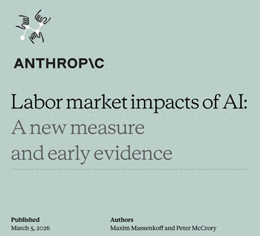 3 月 5 日,人工智能公司 Anthropic 發佈了一份題爲《AI 對勞動力市場的影響:一種新衡量標準與早期證據》(Labor market impacts of AI: A new measure and early evidence)的研究報告。該報告由經濟學家 Maxim Massenkoff 和 Peter McCrory 撰寫,基於 Claude 的實際使用數據對這一問題進行了分析。報告的結論是:目前大多數已有工作經驗的從業者崗位還相對穩定,但剛進入就業市場的年輕求職者面臨更大的挑戰。