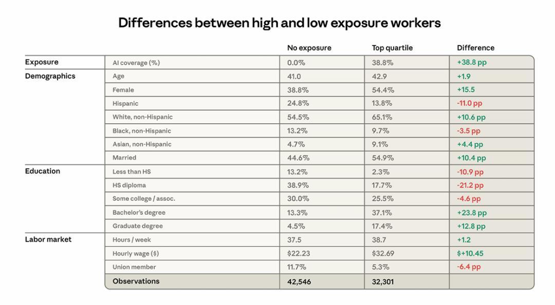 但根據 2022 年秋季美國當前人口調查(CPS)數據,Anthropic 的研究發現,處於 AI 暴露度最高 25% 區間的勞動者呈現出不同特徵:平均年齡較大,收入比低暴露羣體高 47%,受教育程度也更高。在低暴露羣體中,擁有研究生學歷的比例爲 4.5%,而在高暴露羣體中這一比例爲 17.4%。