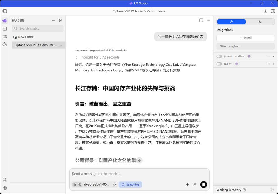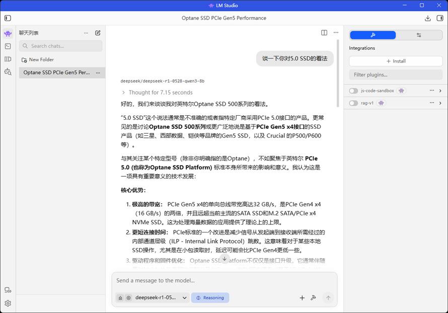 我們先使用LM Studio在PC550 2TB上部署一個DeepSeek-R1-0528-Qwen3-8B本地輕量級推理模型。
