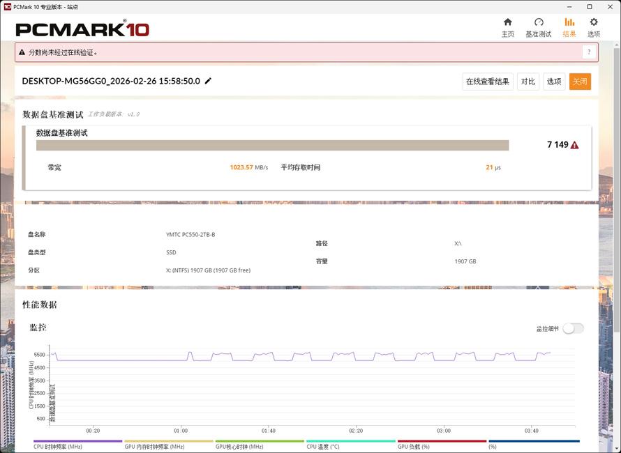 PCMARK10的數據盤基準測試,PC550 2TB得分爲7149分,平均帶寬1023.57 MB/s,平均存取時間爲21 μs。