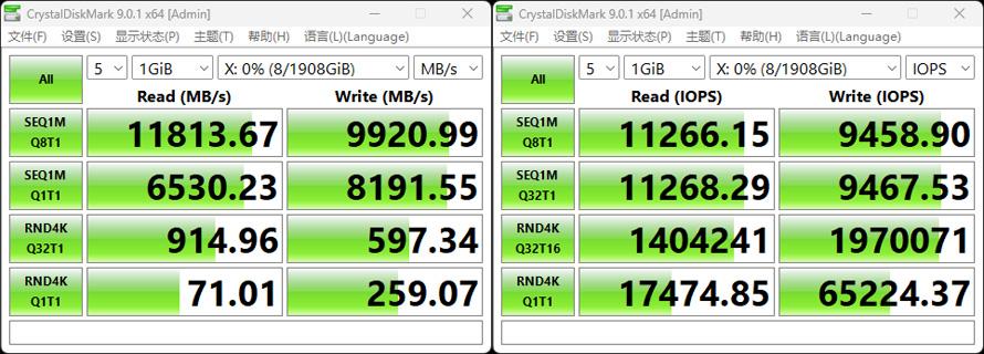 實測順序讀取速度爲11814 MB/s,順序寫入速度爲9921 MB/s,符合官方標稱數值區間。隨機讀寫性能方面,讀取爲1404K IOPS,寫入爲1970K IOPS,更是全面超越官方標稱值。