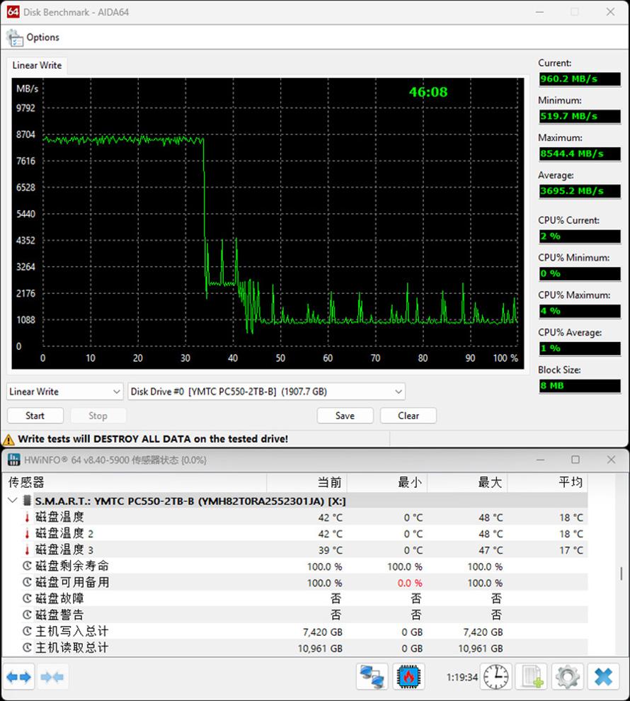 進行Linear Write全盤寫入測試,PC550 2TB耗時46分08秒完成;搭配主板自帶被動散熱片下峯值溫度也只有48℃。