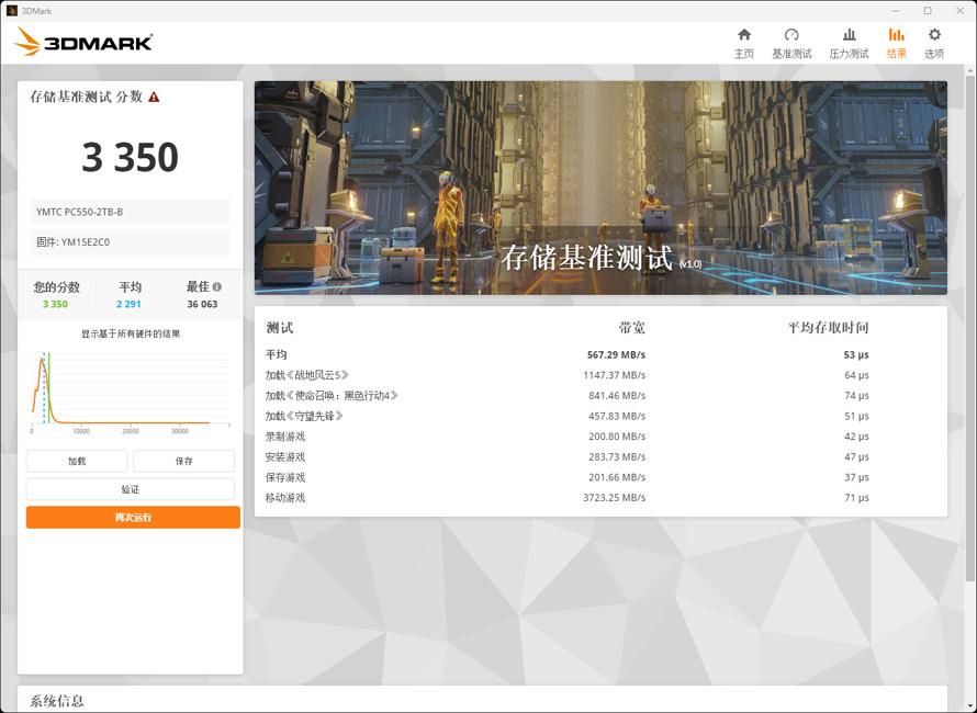3DMARK存儲基準測試,以模擬SSD在真實遊戲場景中的性能表現。PC550 2TB在測試中得到了3350分,平均帶寬爲567.29 MB/s,平均存取時間爲53 μs。