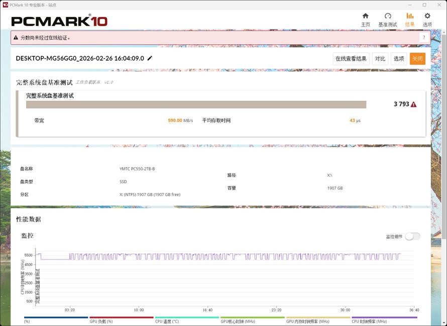 PCMARK10的完整系統盤基準測試,PC550 2TB得分爲3793,平均帶寬590.00 MB/s,平均存取時間爲43 μs。