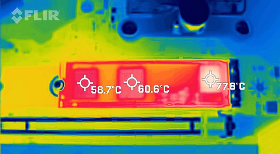 在全盤寫入的情況下,時間也只增加了1分51秒,但整體曲線與使用散熱片時基本沒有變化,證明該盤完全可以脫離散熱片使用。HWINFO軟件報告峯值溫度爲63℃,溫控表現依舊出色;紅外測溫下主控最高爲77.8℃,閃存最高爲60.6℃。