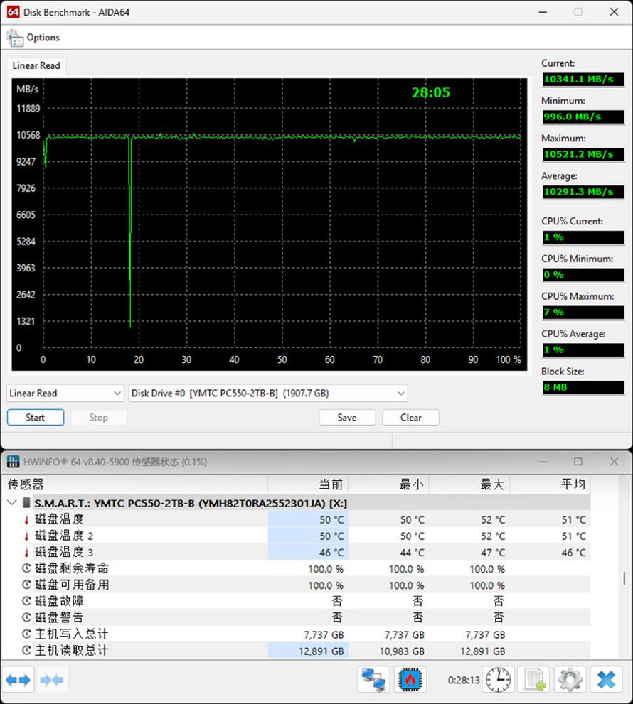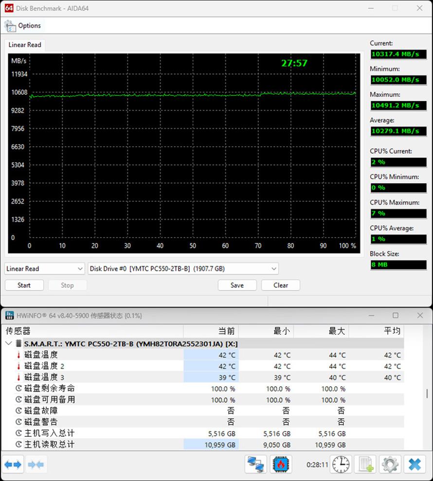 使用AIDA64進行Linear Read全盤讀取測試,PC550 2TB耗時27分57秒完成;在搭配主板自帶被動散熱片下峯值溫度僅爲44℃。