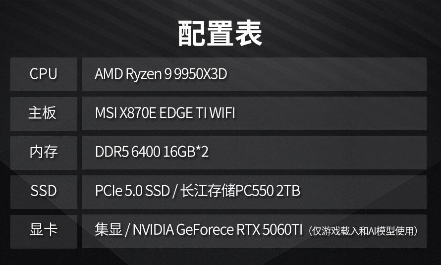 本次測試選用的是AMD平臺,採用Ryzen 9 9950X3D處理器,搭配MSI X870E EDGE TI WIFI主板。將其安裝在顯卡插槽上方的CPU直連M.2接口,使用主板自帶散熱片。